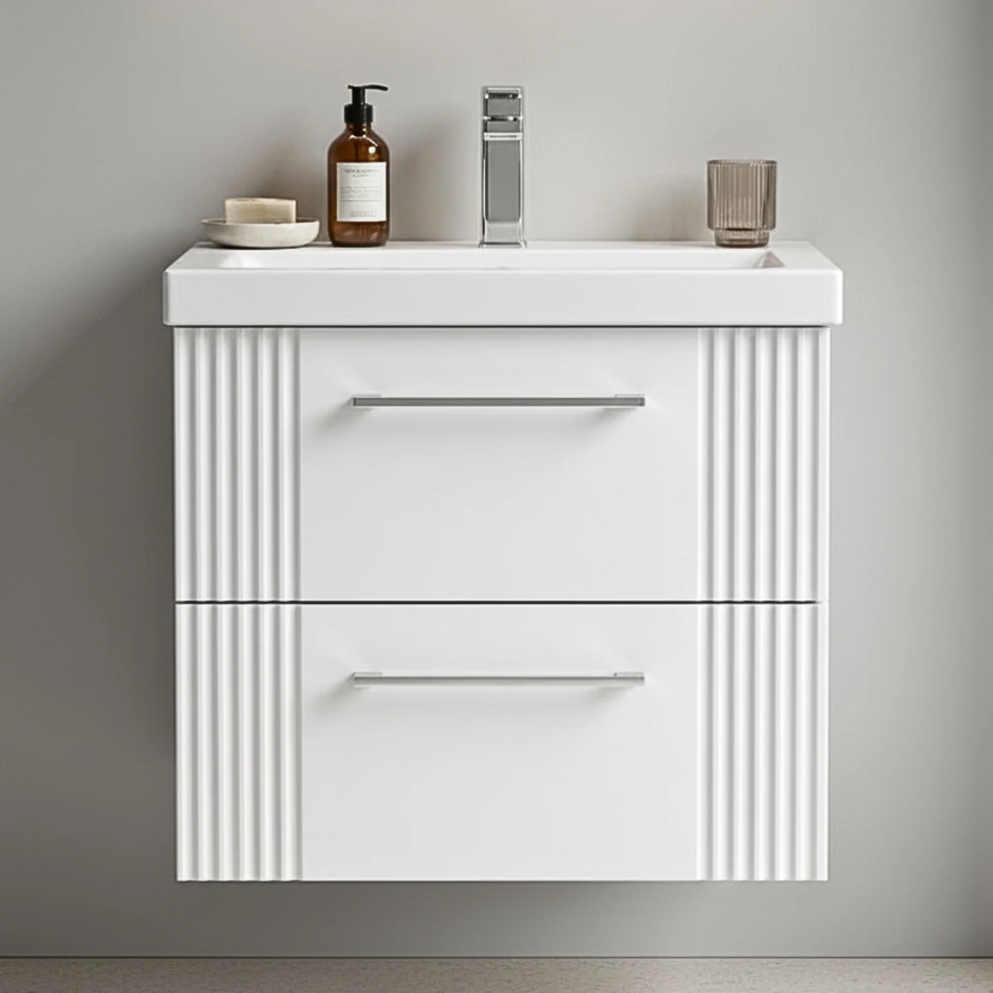 Belvide Partial Fluted 2 Drawer Wall Hung Vanity Unit with Mid-Edge 1 Tap Hole Ceramic Basin