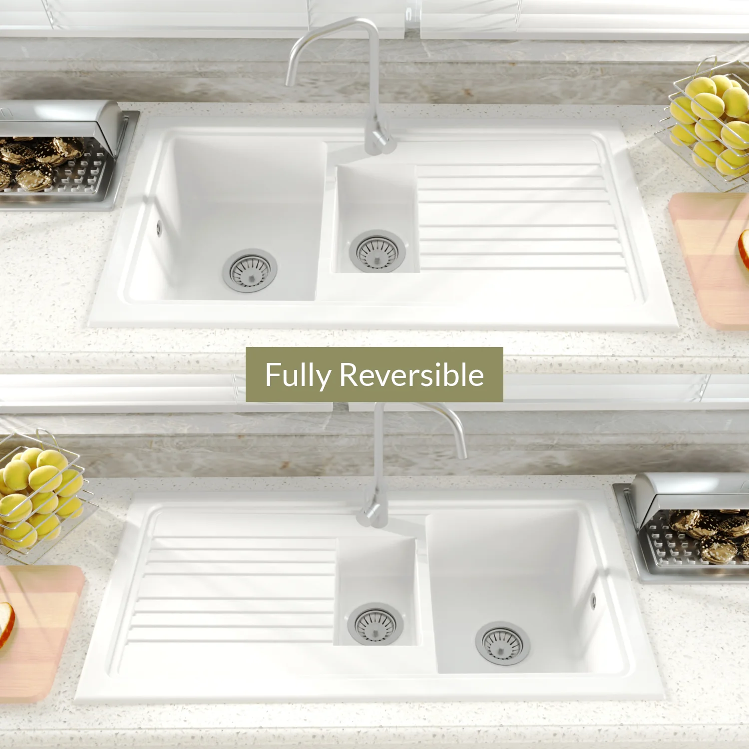 Streamline your kitchen with this fireclay counter-top sink, offering genuine choice in finish, bowl configuration, and drainer style to suit your exact needs. At 101cm wide, this generous inset design delivers serious workspace whether you favour single bowl capacity or the flexibility of a 1.5 bowl layout, while the choice of grooved or plain drainer adds further versatility. Available in classic white or contemporary grey, each option combines traditional fireclay craftsmanship with modern counter-top installation for a refined, hardwearing focal point.