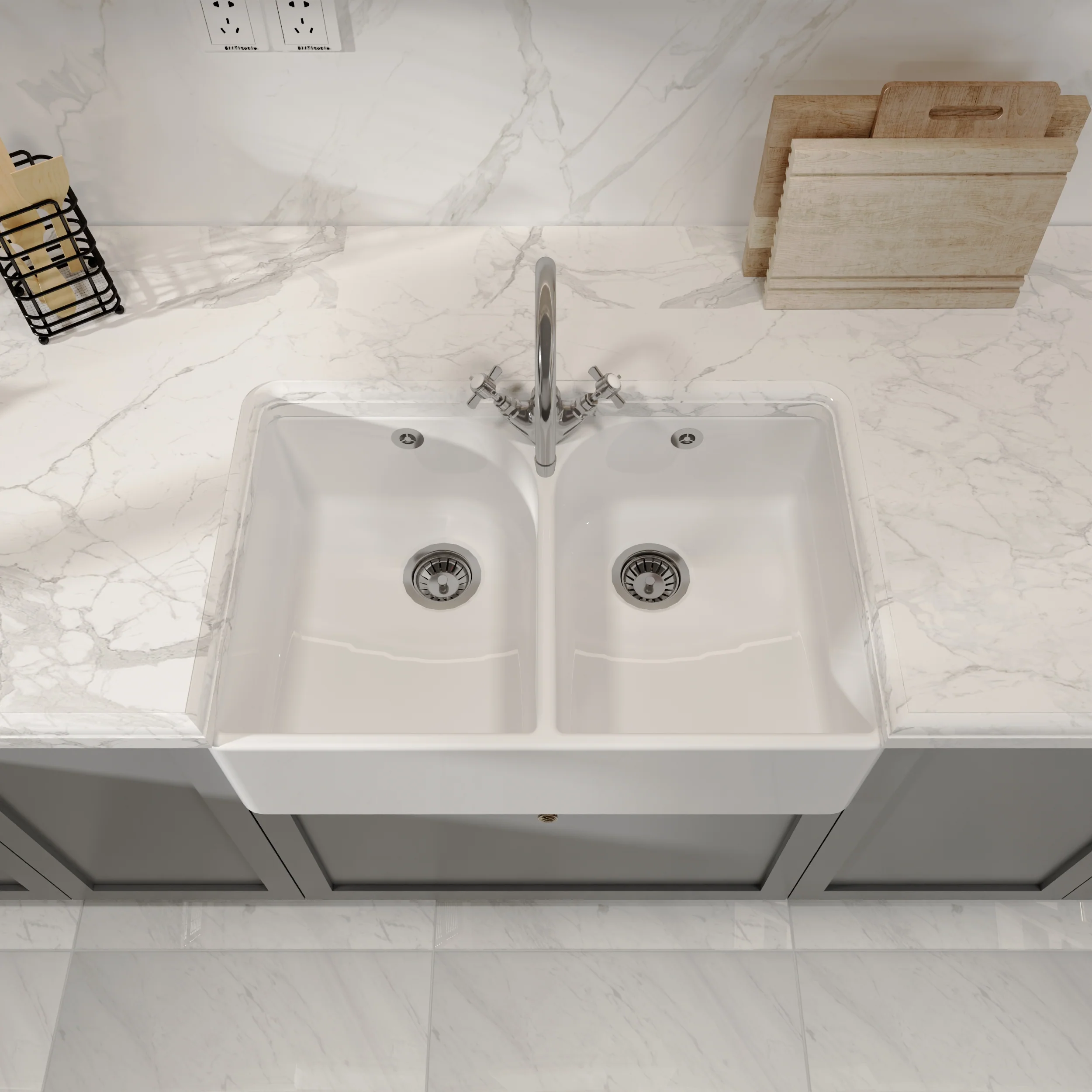 Double Bowl Fireclay Ceramic Butler Kitchen Sink with Full Weir, Overflows and Tap Hole - 795mm
