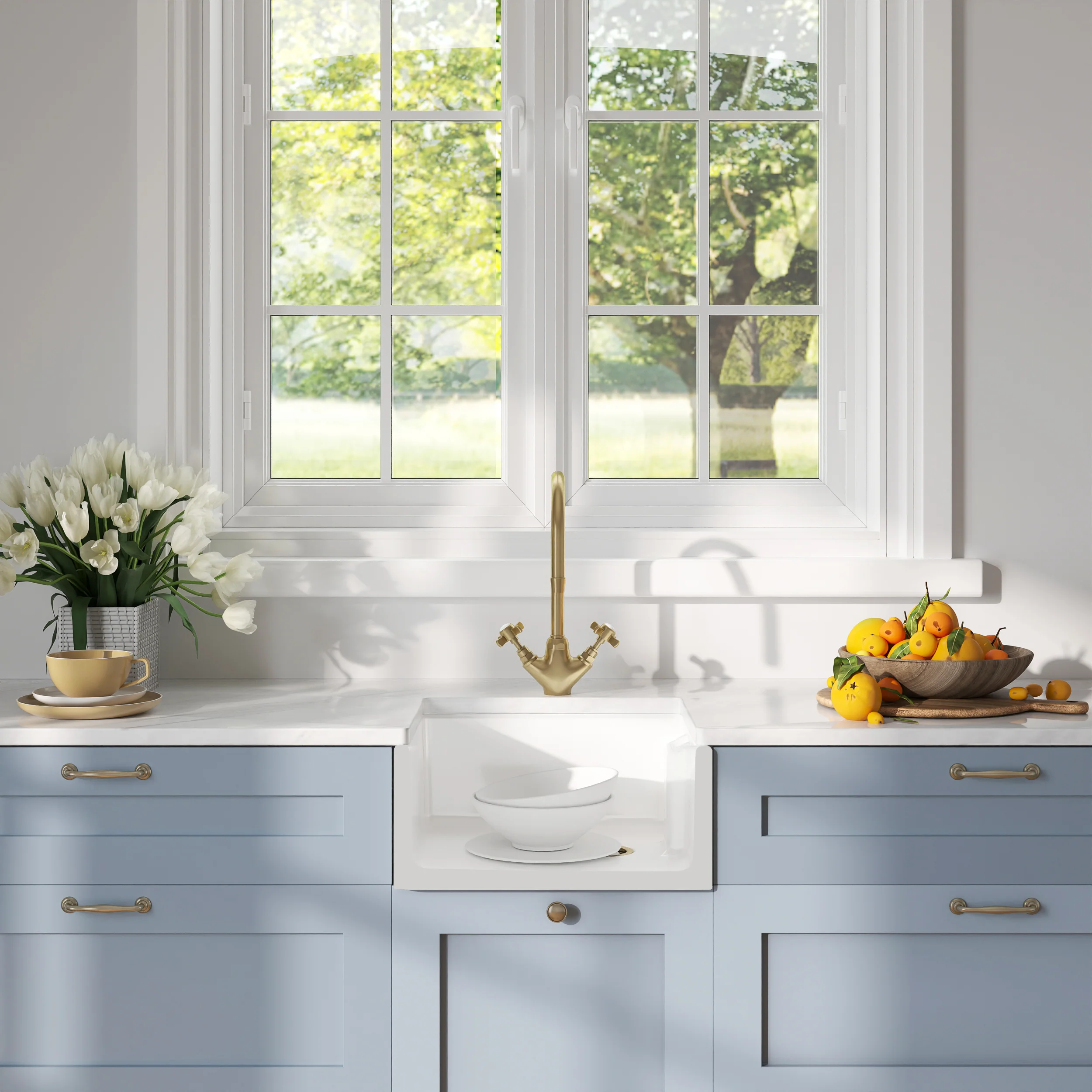 Fireclay Kitchen Bundle - Compact Single Bowl Belfast Sink, Strainer Waste & Mono Crosshead Tap, 460mm - Brushed Brass