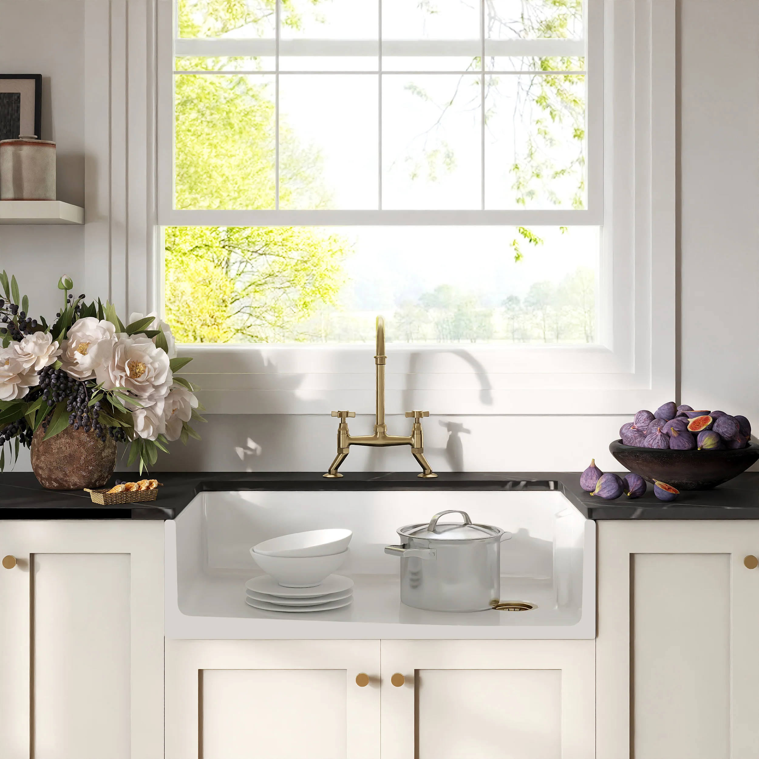 Fireclay Kitchen Bundle - Single Bowl Belfast Sink, Strainer Waste & Bridge Crosshead Mixer Tap, 895mm - Brushed Brass